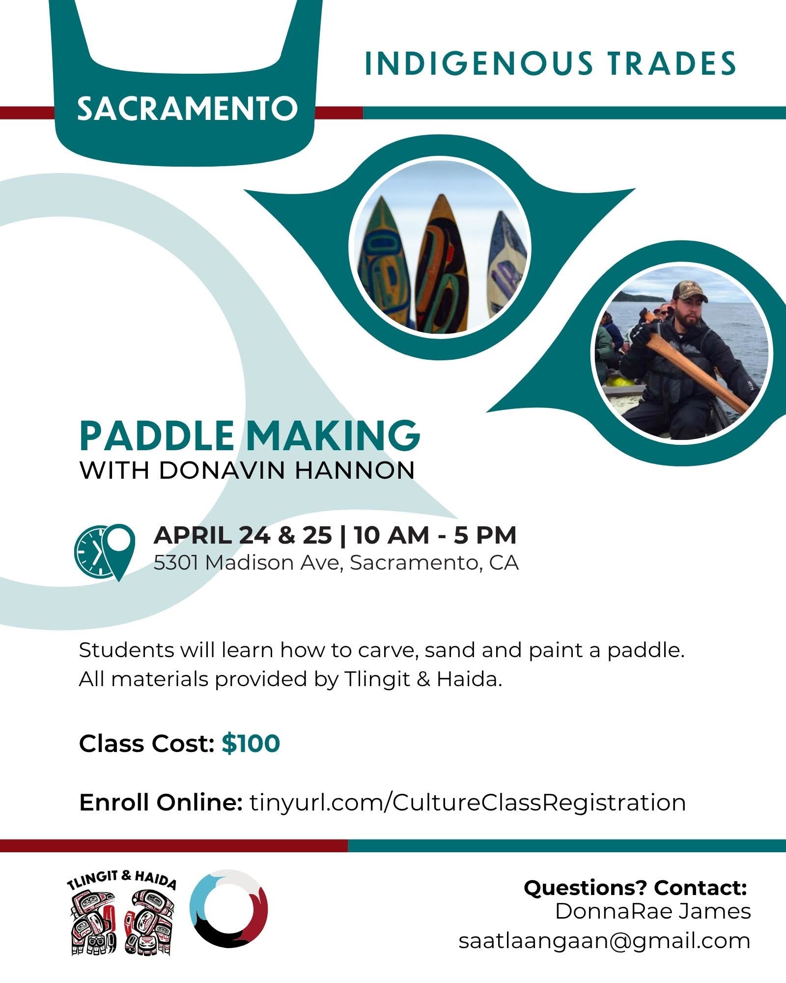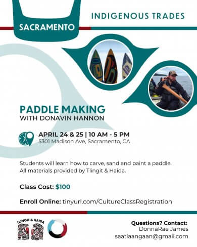 Paddle WorkshopTlingit & HaidaDate & TimeApr 24, 2026 - Apr 25, 202610AM - 5PMLocationT&H Sacramento Office 5301 Madison Ave Sacramento , CA Share EmailDescriptiontinyurl.com/CultureClassRegistration